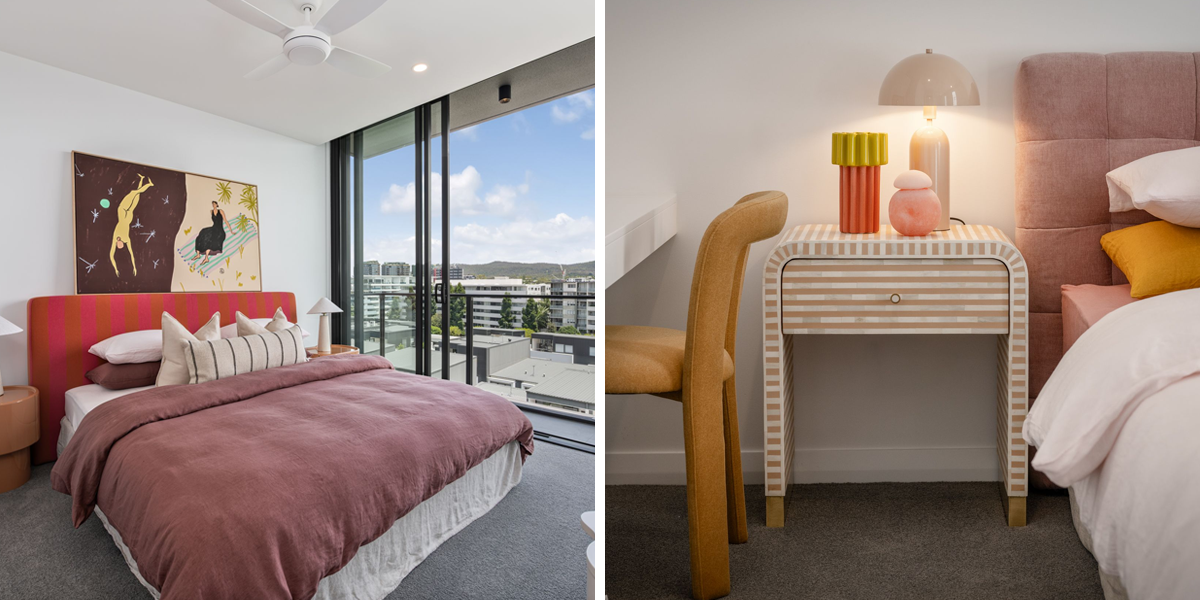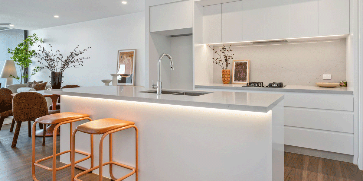 Inside each apartment, functional design and quality finishes support practical daily living. Kitchens include stone benchtops, generous pantry storage and SMEG appliances, complemented by engineered timber flooring to living areas, large-format tiles to bathrooms and soft carpet to bedrooms. Air-conditioning, ceiling fans and considered storage solutions contribute to comfortable and adaptable spaces.